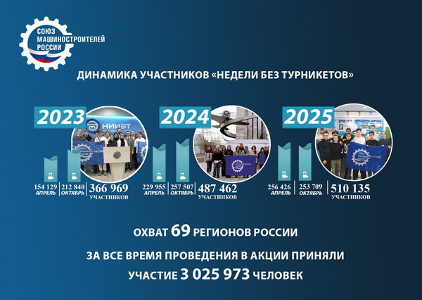В 2025 году Всероссийская акция «Неделя без турникетов», реализуемая Союзом машиностроителей России при поддержке предприятий и образовательных организаций, отметила своё десятилетие. За это время проект стал одним из главных профориентационных инструментов страны, знакомящим школьников и студентов с современным производством и инженерными профессиями. Акция проводится дважды в год - в апреле и октябре, ее формат позволяет будущим инженерам увидеть реальные производственные процессы, познакомиться с технологиями и попробовать себя в роли специалистов разных направлений.