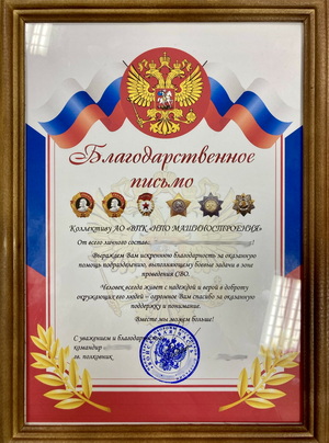 Участвовавшие во встрече бойцы также передали благодарственное письмо от командования своей части в адрес коллектива НПО машиностроения.