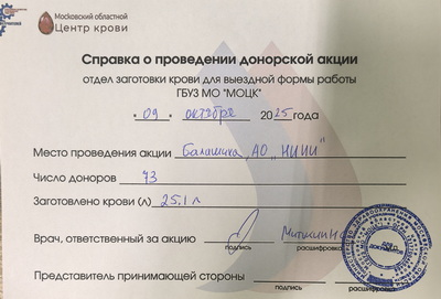 9 октября сотрудники АО «Научно-исследовательский инженерный институт» приняли участие в донорской акции, организованной Московским областным РО СоюзМаш и Московским областным центром крови в рамках программы «Корпоративный донор Подмосковья».