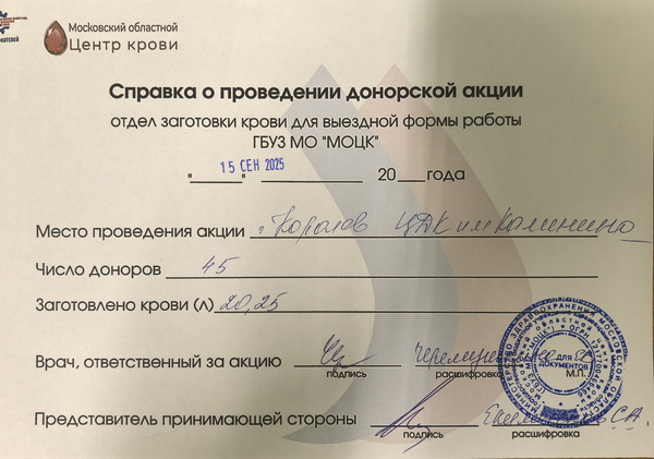 15 сентября в Королеве состоялся День донора, организованный Московским областным центром крови и Московским областным РО СоюзМаш. Участие в акции, проходившей в рамках программы «Корпоративный донор Подмосковья», приняли сотрудники головной фирмы АО «КТРВ» и неравнодушные жители наукограда.