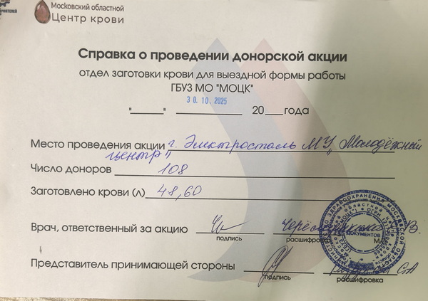 30 октября в Электростали прошел День донора, участниками которого стали живущие в городе сотрудники входящих в Московское областное РО СоюзМаш предприятий. Акцию организовали реготделение и Московский областной центр крови в рамках программы «Корпоративный донор Подмосковья»