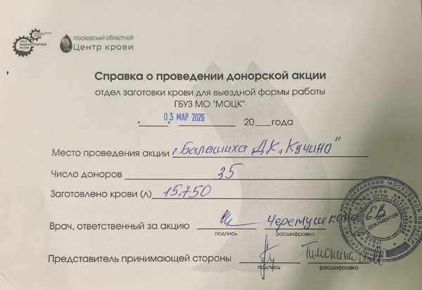 Персонал отдела заготовки Московского областного центра крови принял 35 человек, которые сдали 15,75 л крови. Среди участников акции были сотрудники балашихинских предприятий, входящих в Московское областное реготделение Союза машиностроителей России.