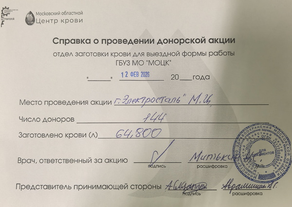В этот раз персонал отдела заготовки крови МОЦК принял 144 человека, которые сдали 64,80 крови. Среди доноров было немало проживающих в Электростали сотрудников предприятий, входящих в реготделение.