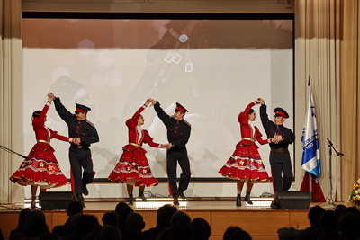 Затем ведущий мероприятия А. Дотолев объявил торжественный внос флага первичной профсоюзной организации АО «ВПК «НПО машиностроения» и попросил всех встать. Знаменная группа кадетов внесла флаг на сцену.
